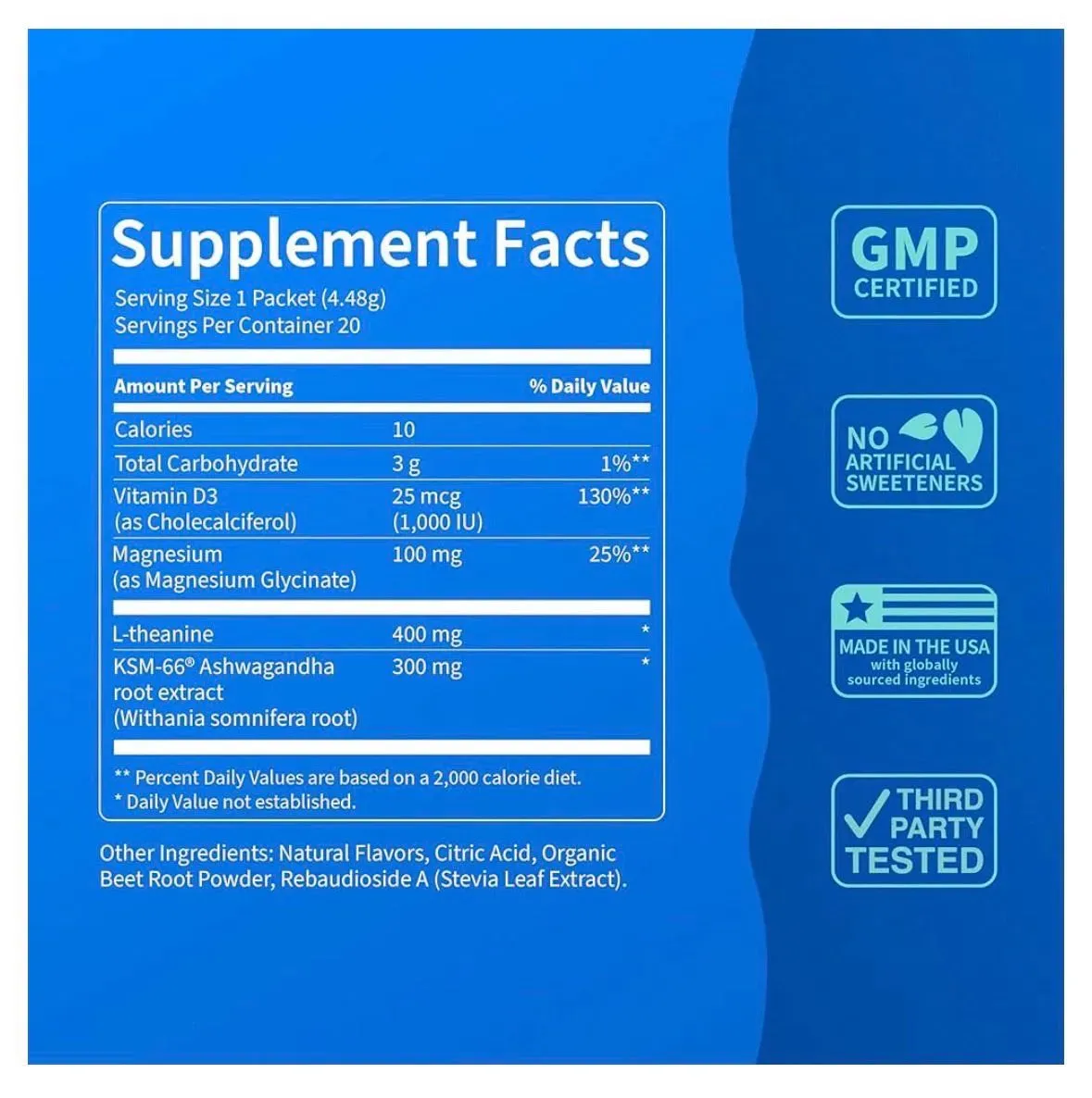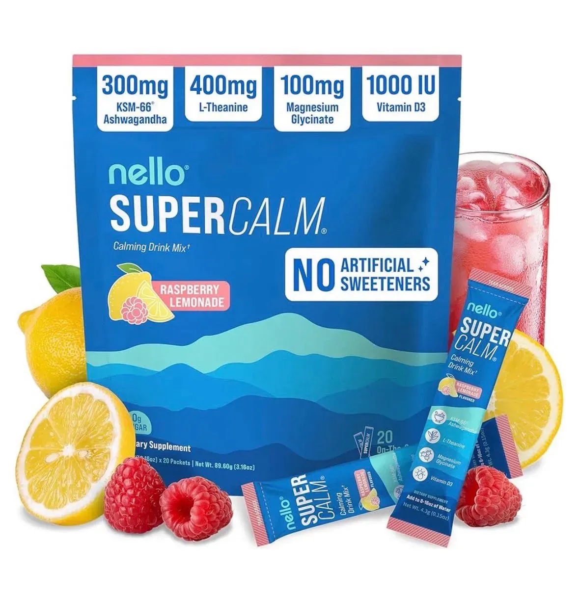 Nello Supercalm - Mezcla de bebida en polvo, reductor de cortisol y suplemento para ayudar al sueño, L teanina, Ksm-66 Ashwagandha, glicinato de magnesio, vitamina D 3, sin azúcar, sin OMG, On The Go, 20 unidades